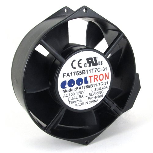 The high speed 172 by 150 by 55 millimeter 115V AC axial fan is housed in die cast aluminum with thermoplastic blades. Containing long life dual ball bearings, the fan can run continuously for 67,000 hours and be mounted in any direction. Has terminal connectors and can be plugged into a standard outlet with a fan power cord, sold separately. Cooltron fans are certified by CE, UL, TUV, and RoHS; and found in various Samsung and Eaton servers and UPS systems.